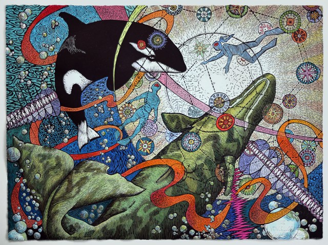 The Vencello, Rachel Durfee, ©2023, woodcut and watercolors, 22″ x 30″
